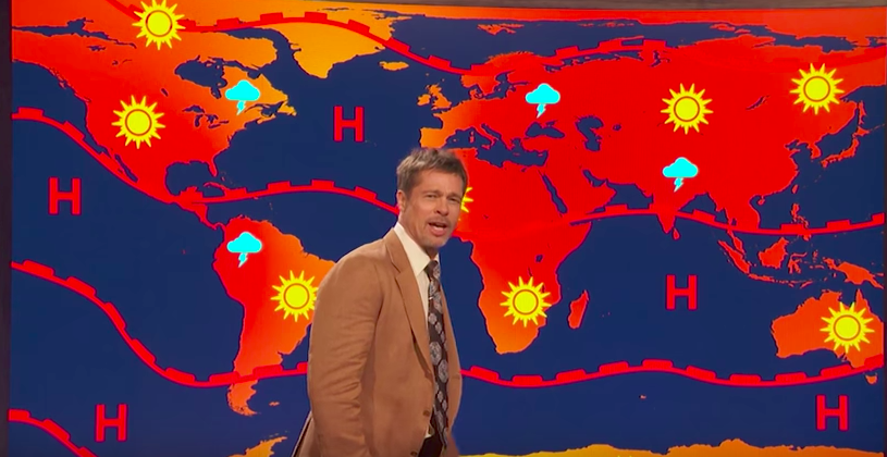 En ese momento la cámara corta a Pitt quien aparece en la pantalla con un traje marrón y una corbata ancha con estampados delante de un mapa del clima.