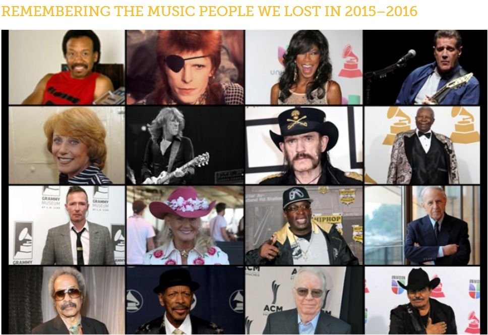 Maurice White, David Bowie, Natalie Cole, Glenn Frey; Lesley Gore, Paul Kantner, Lemmy Kilmister, B.B. King; Scott Weiland, Lynn Anderson, Kool DJ AJ, Pierre Boulez; Allen Toussaint, Ornette Coleman, Billy Sherrill, y Joan Sebastian, fueron parte de los homenajeados de esta edición del Grammy. Foto de Grammy,