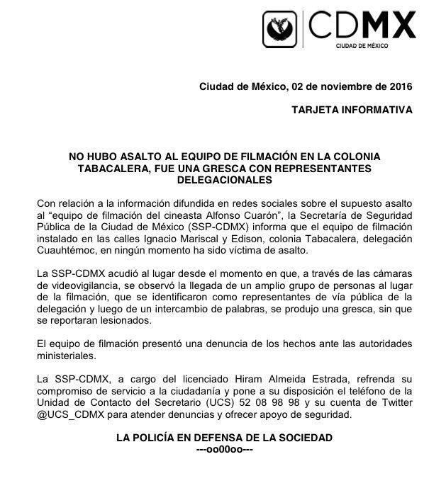 “El día de ayer, martes 1ero de noviembre de 2016, mientras miembros de nuestro equipo de producción ejercían su trabajo en la locación de la calle José María Iglesias, Col. Tabacalera, con permisos oficiales expedidos por la Comisión de Filmaciones de la Ciudad de México, fueron agredidos por trabajadores de la Delegación Cuauhtémoc.