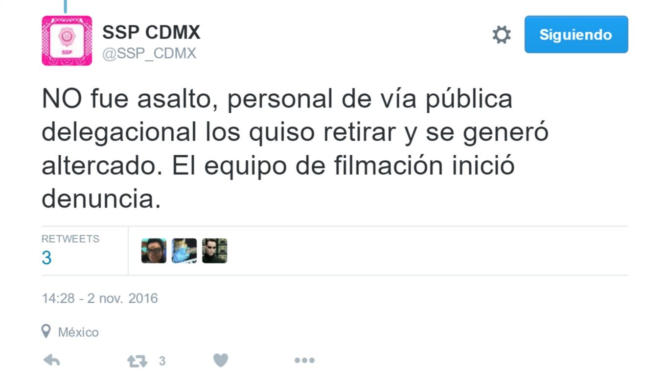 No obstante, a través de su cuenta de Twitter, la Secretaría de Seguridad Pública de la Ciudad de México indicó que no se trata de un asalto sino de un altercado entre autoridades de la zona y el equipo de filmación del cineasta.