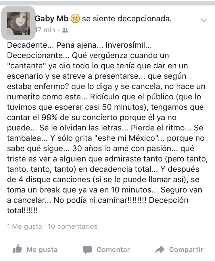 Ante ese exabrupto, los miles de fans que se congregaron con la intensión de disfrutar los éxitos del cantante, tuvieron que abandonar el lugar con una mezcla de sentimientos y emociones que iban de la sorpresa y el desconcierto al enojo y frustración.
