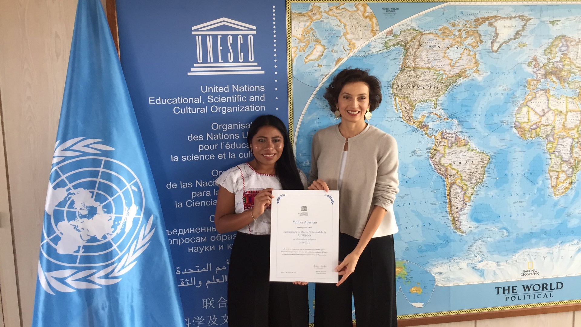 La directora general de la Unesco, Audrey Azoulay, otorgó el cargo de embajadora de buena voluntad a Yalitza en una ceremonia celebrada en París