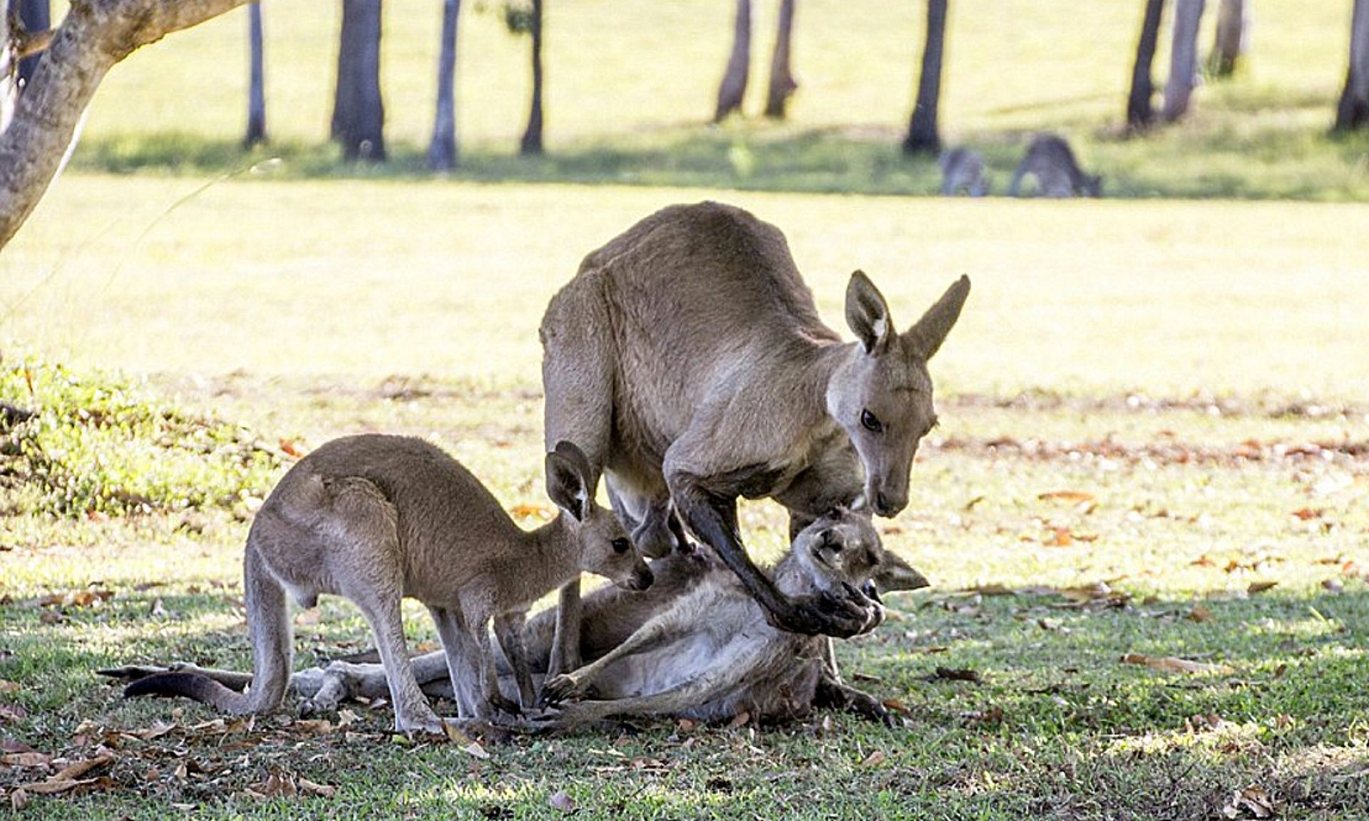 Así, mientras la madre canguro yacía en el suelo, los dos machos en un principio se dedicaron a observar. El joven se quedó mirando todo el tiempo a la hembra, y adoptó una postura protectora, situándose cerca del cuerpo de la canguro muerta.