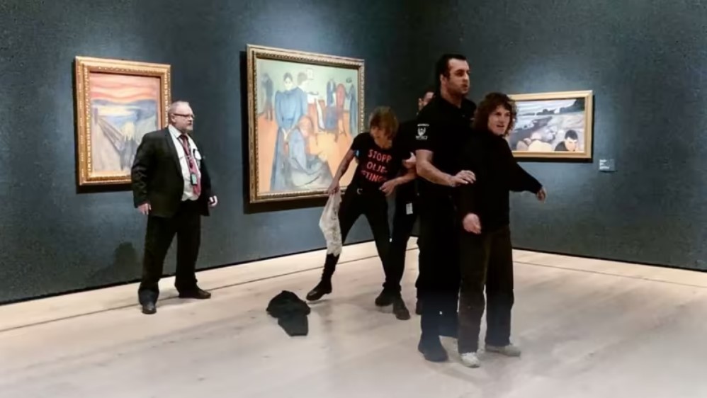 Dos de las activistas trataron de adherirse al cuadro mientras otra filmaba la escena, gritando “No habrá ningún grito cuando la gente muera” o “Ningún grito cuando los políticos ignoran a la ciencia”, recogió la agencia NTB.