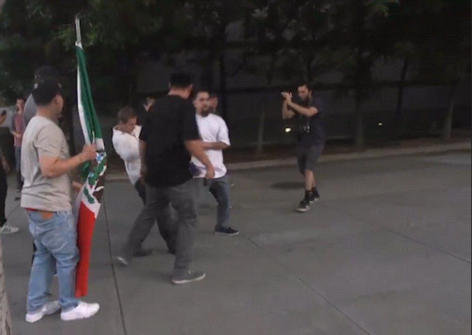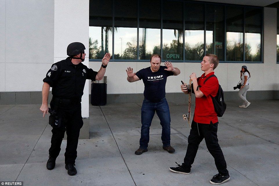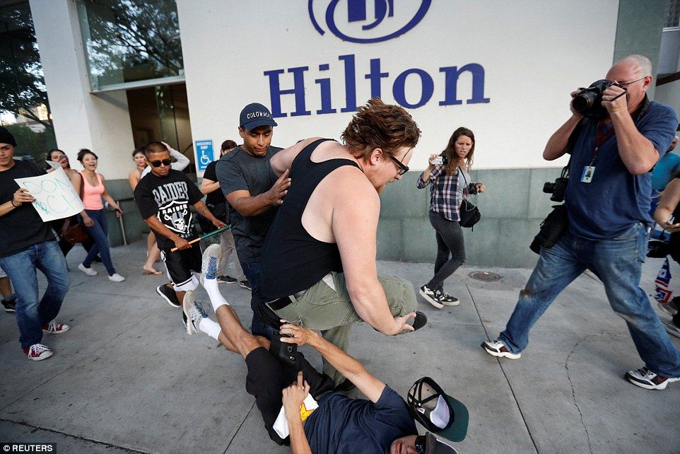 Una docena o más de personas recibieron golpes, y los agresores rompieron también ventanas de automóviles. Los inconformes arrebataron gorras con lemas en apoyo de Trump y les prendieron fuego en el suelo. Al menos una mujer recibió el impacto de un huevo.