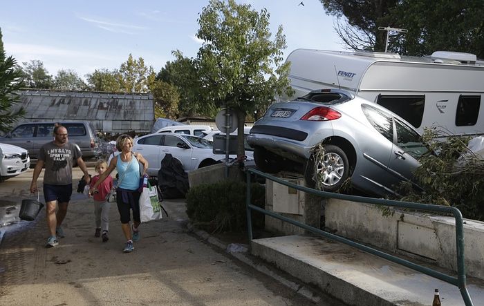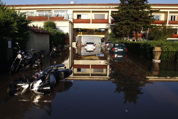 Torrentes de agua lodosa inundaron caminos, edificios y vías férreas interrumpiendo el movimiento en la costa del Mediterráneo el domingo.