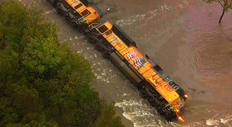Las precipitaciones también ocasionaron que un tren de Union Pacific descarrilara, aunque el conductor y el ingeniero lograron salir con vida tras ser rescatados.