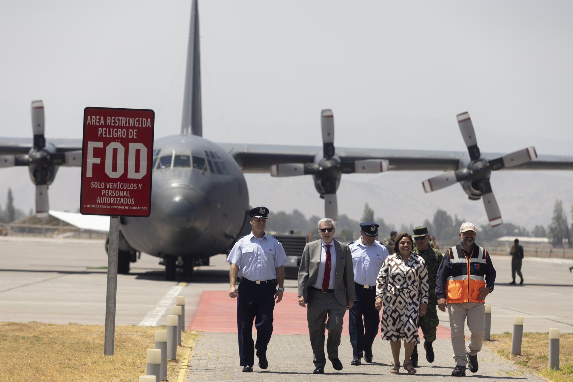 El ministro de Relaciones Exteriores de Chile, Alberto van Klaveren (2i), junto a la embajadora de México en Chile, Laura Moreno (3d), entre otras autoridades, participan en la recepción de un avión de la Fuerza Aérea de México que aterrizó con ayuda humanitaria, en el Grupo 10 de la Fuerza Aérea de Chile (FACh), en Santiago (Chile). Foto de EFE/Ailen Díaz