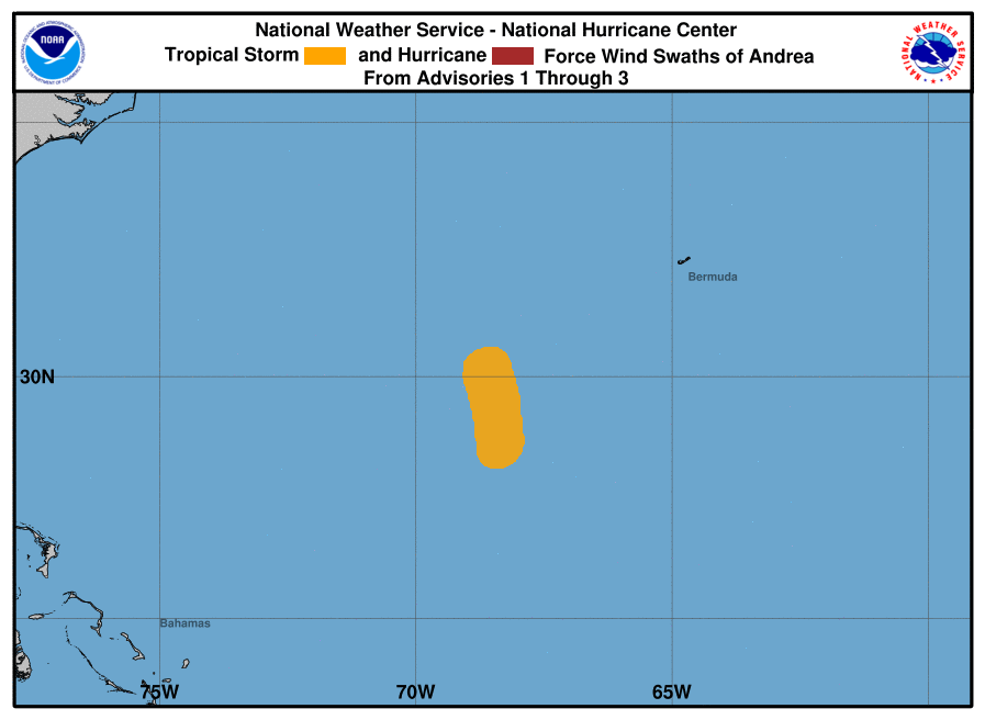 El NHC informó que el centro de la tormenta subtropical ‘Andrea’ está ubicado cerca de la Latitud 30.0 Norte, Longitud 69.0 OESTE con vientos máximos sostenidos cerca de 65 kilómetros por hora.