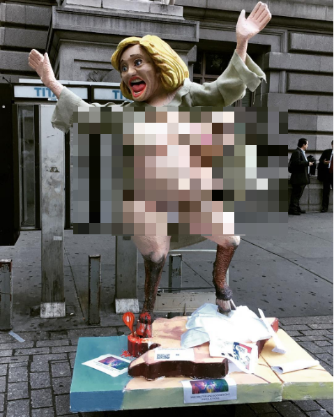 Una estatua de la candidata demócrata Hillary Clinton desnuda y con patas de cabra apareció este martes en una zona del bajo Manhattan, atrayendo a cientos de curiosos que buscaban tomarle una foto, así como reacciones violentas por parte de sus seguidores.