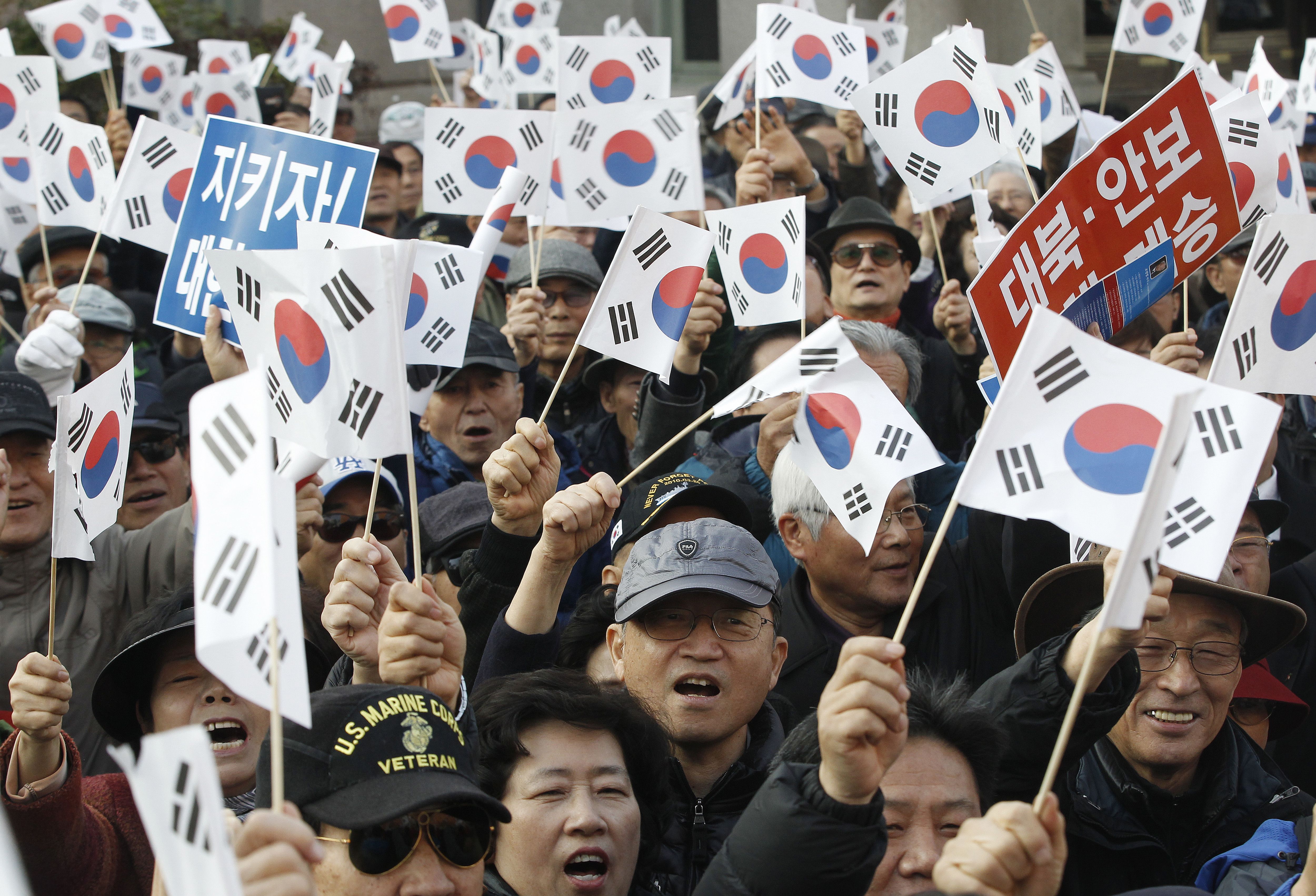 Maifestantes partidarios de la presidenta de Corea del Sur, Park Geun-hye, ondean banderas nacionales durante una protesta contra su dimisión en la capital surcoreana, Seúl, el 17 de noviembre de 2016. Foto de AP.