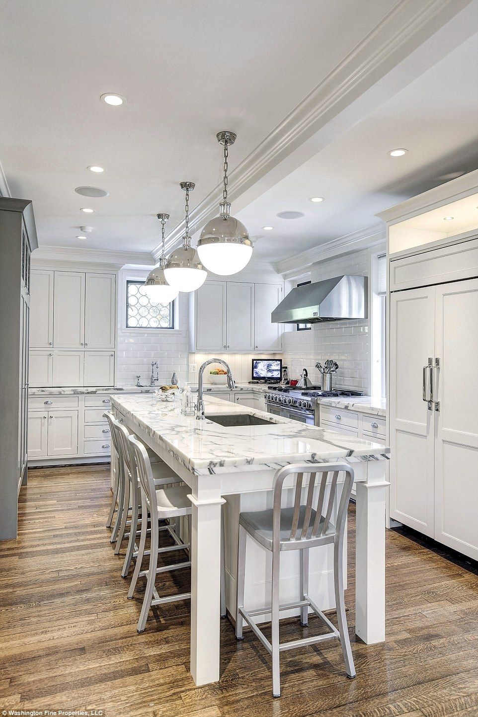 La cocina gourmet de la elegante vivienda está equipada con una estufa de seis quemadores y una habitación especial para el mayordomo, además de dar acceso al comedor.