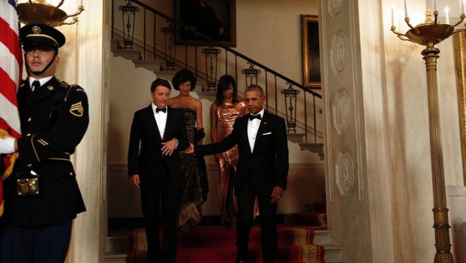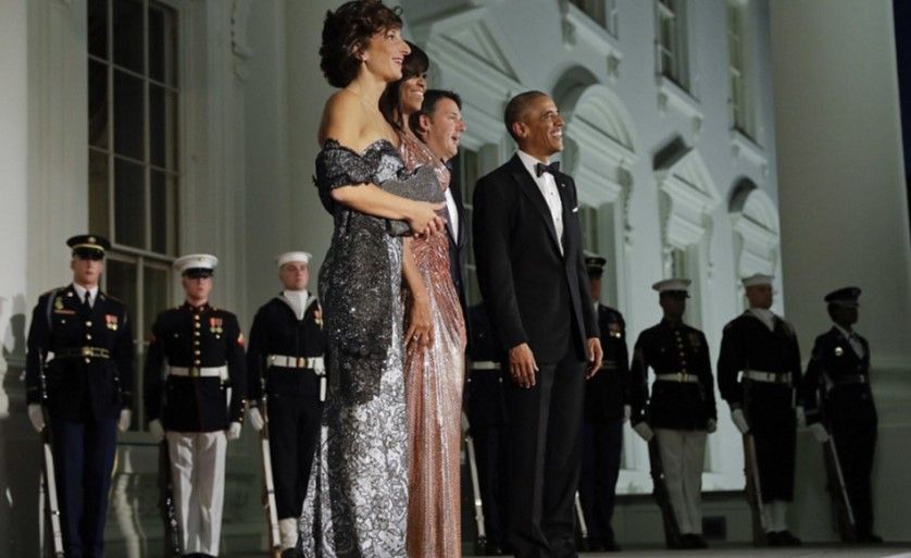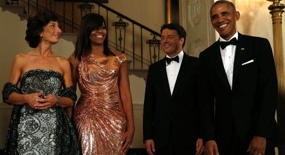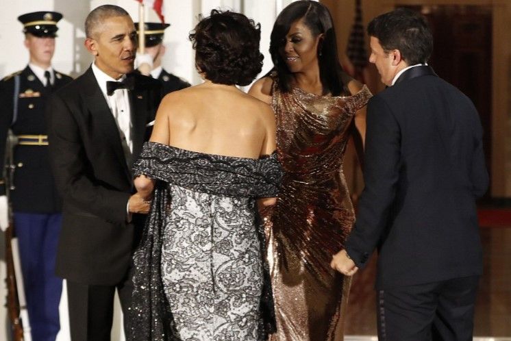 La cena fue en honor del Primer Ministro italiano Matteo Renzi y su esposa y Michelle lució un vestido de la casa italiana Versace