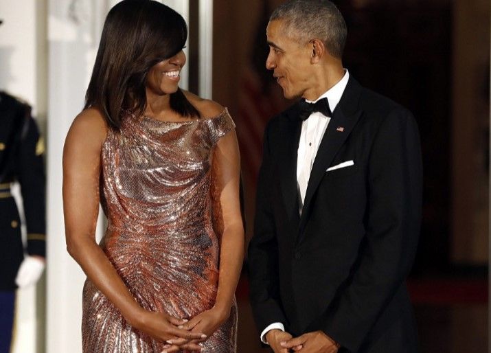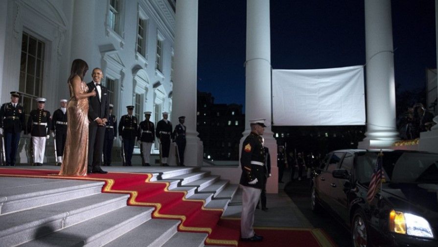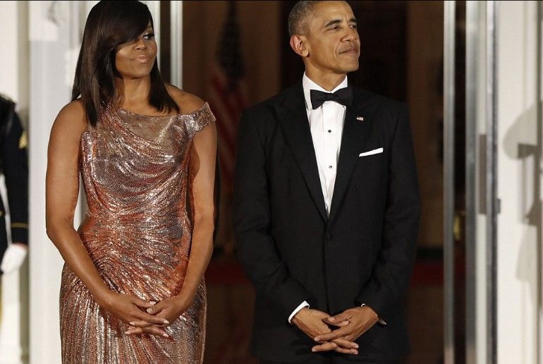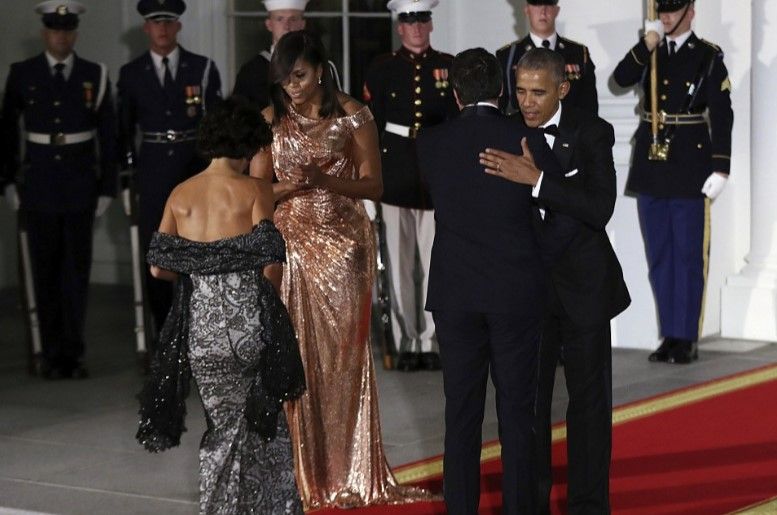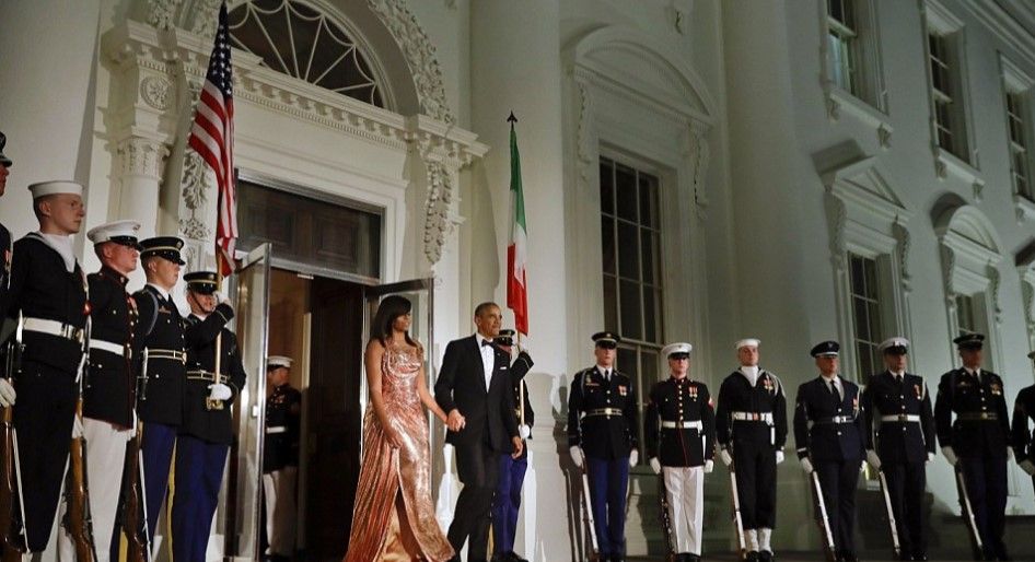 En la que será la ultima cena de Estado de los Obama, Michelle sorprendió a todos con un vestido Versace para honrar al invitado de la noche, el Primer Ministro italiano Matteo Renzi y su esposa, Inés Landini.