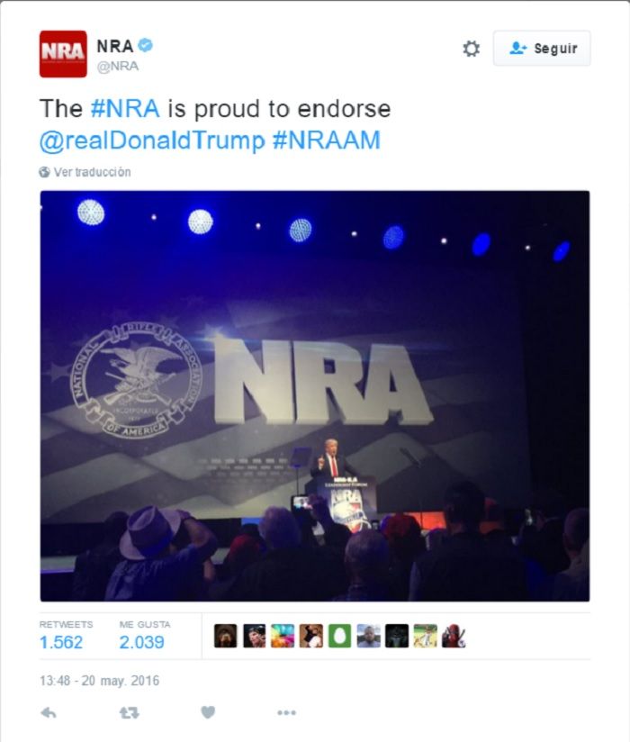 Trump llamó el respaldo como un “fantástico honor”. La Asociación Nacional del Rifle confirmó dicho pronunciamiento a través de su cuenta de Twitter.