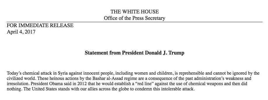 Hoy el ataque químico en Siria en contra de gente inocente, incluyendo mujeres y niños, es reprochable y no puede ser ignorado por el mundo civilizado. Estos atroces actos por el régimen de Bashar al-Assad son consecuencia de la debilidad de la pasada administración y la irresolución. El presidente Obama dijo en 2012 que él establecería una “línea roja” en contra del uso de armas químicas y no hizo nada. Estados Unidos está con nuestros aliados en todo el mundo para condenar este intolerable ataque.