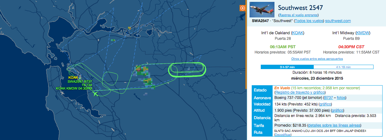 Hoy porla tarde, el vuelo de Southwest que cubre la ruta de Oakland a Chicago Midway, tuvo que dar vueltas en círculos en la bahía para quemar combustible tras la detección de fallas en uno de los trenes de aterrizaje.