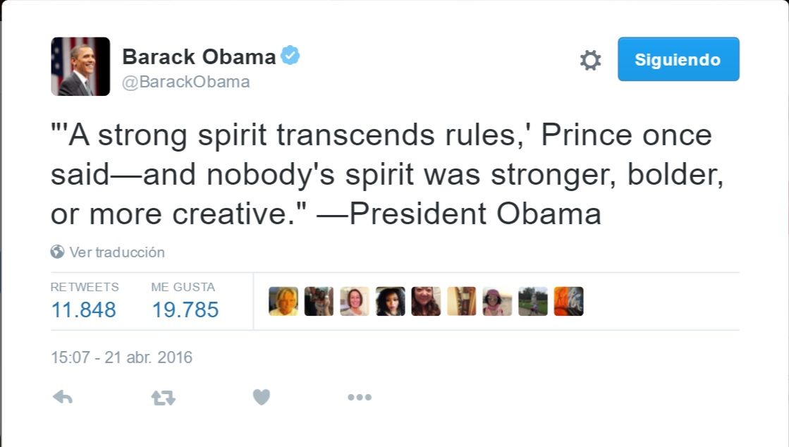 Recordó que en alguna ocasión Prince dijo que “un espíritu fuerte trasciende reglas”, y que en la vida real “ningún espíritu fue tan fuerte, audaz y más creativo. Nuestros pensamientos y oraciones están con su familia, su banda y todos los que lo amaron”.