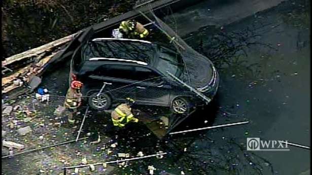 Un automovilista que conducía una camioneta todoterreno se salió del camino, atravesó una cerca y cayó sobre el techo de un supermercado en Pittsburgh, dijeron las autoridades.