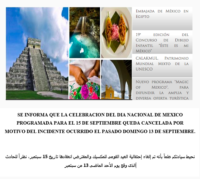 La embajada de México en El Cairo, Egipto, anunció la cancelación del festejo por el Día de la Independencia programada para el martes en su sede en la capital egipcia.