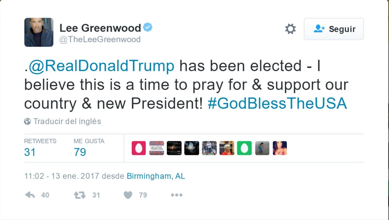 “Me siento honrado de volver a formar parte de la historia y cantar para el presidente electo Donald Trump”, señaló Greenwood en un comunicado, así como en un mensaje en Twitter. “Este es un momento para superar los desafíos de nuestro país y unirnos. Mi esposa Kim y yo esperamos las ceremonias de inauguración”, señaló.