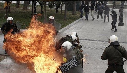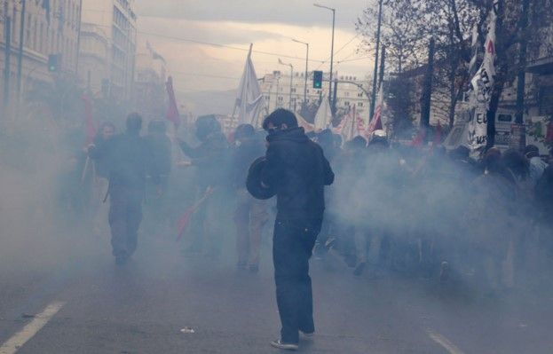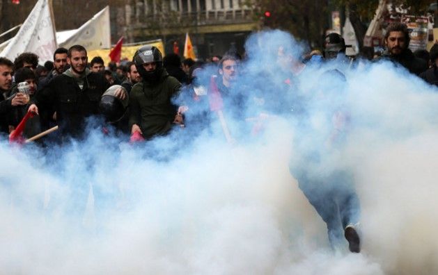 La policía usó gas lacrimógeno y granadas aturdidoras contra decenas de anarquistas encapuchados. Vendedores callejeros, turistas y transeúntes escaparon a cubrirse al estallar la violencia, al tiempo que un periodista fue atacado por anarquistas y hospitalizado, pero sus heridas no eran graves, dijo la policía.