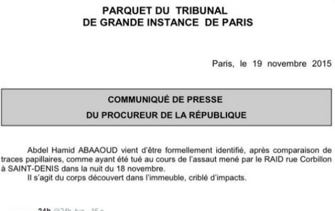 “Abdelhamid Abaaoud ha sido formalmente identificado, después de comparar las huellas papilares, como uno de los asesinados en el asalto (…) Éste es el cuerpo que nosotros hemos encontrado en el inmueble, plagado de impactos”, dice el comunicado.