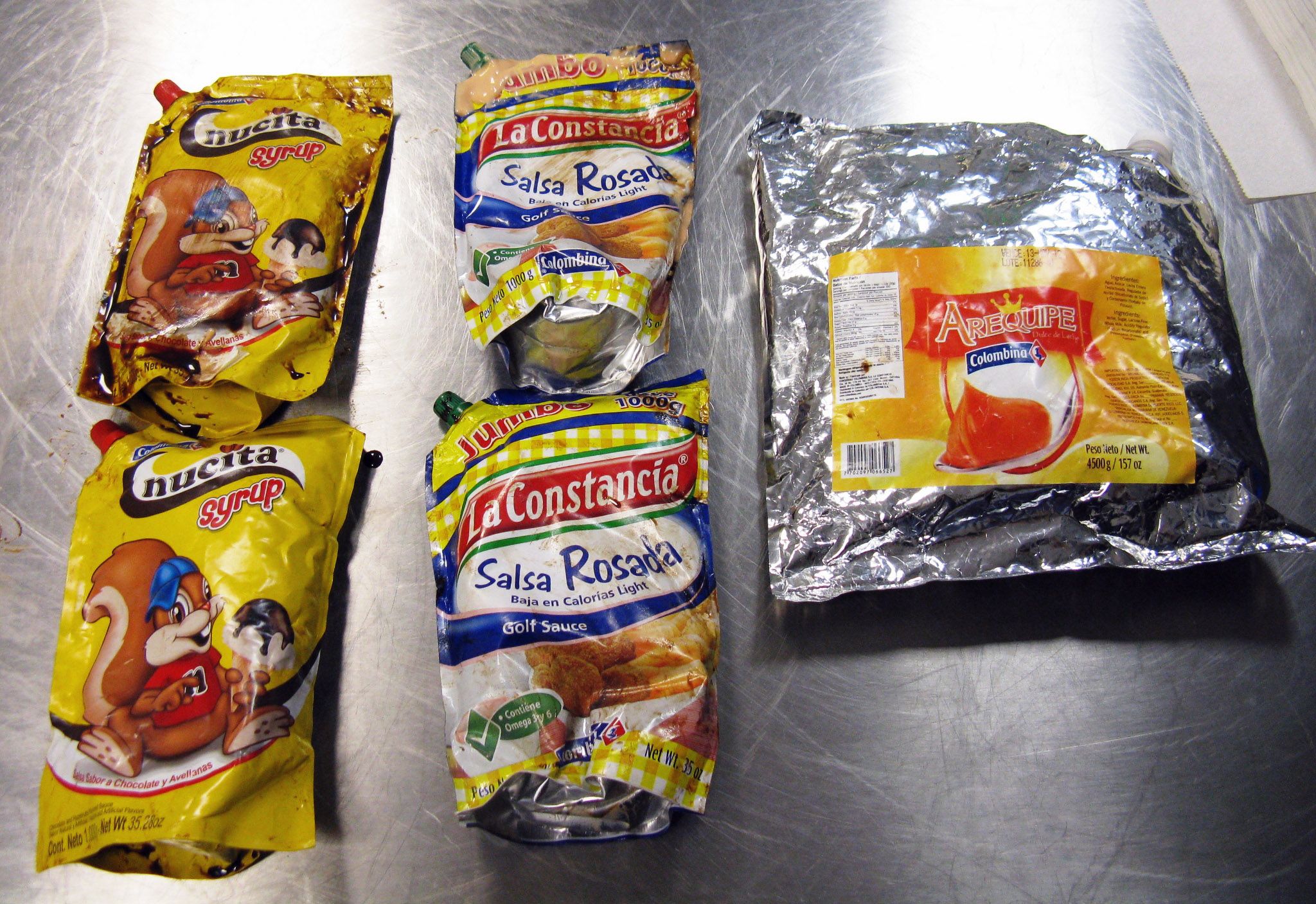 Una mujer que viajaba con su hija desde España llevaba bolsas con chocolate líquido y condimentos para ensaladas que despertaron las sospechas de los agentes aduaneros en el aeropuerto de Los Ángeles en febrero del 2012. Las abrieron y hallaron una bolsa de plástico con cerca de cinco kilos de pasta de cocaína.