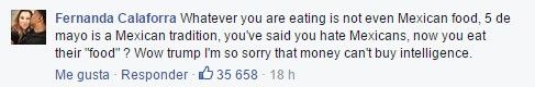 “Demasiado mal, un taco bowl no es mexicano, la Trump Tower Grill tampoco lo es, no estás comiendo taco bowls de Nueva York porque estás en Virginia Occidental hoy, Cinco de mayo no es una celebración hispana es una mexicana, y eres del mismo color que la tostada que cubre al taco bowl.