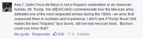 Cinco de mayo no es una celebración hispana ni estadounidense, sr. Trump. Nosotros (Los mexicanos) conmemoramos cómo el ejército mexicano venció a una de las más respetables fuerzas armadas del siglo XIX -un ejército que sobrepasaba en número y experiencia. No me importa si la Trump Tower Grill hace los mejores taco bowls “hispanos”, aún así no son comida mexicana… ¿pero cómo podría saber eso?
