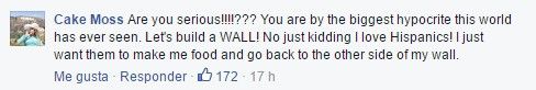 ¿¡Es en serio!? Eres el hipócrita más grande que he visto en este mundo. ¡Construyamos un MURO! Solo bromeaba ¡amo a los hispanos! Solo los quiero para hacer comida y regresar al otro lado del muro