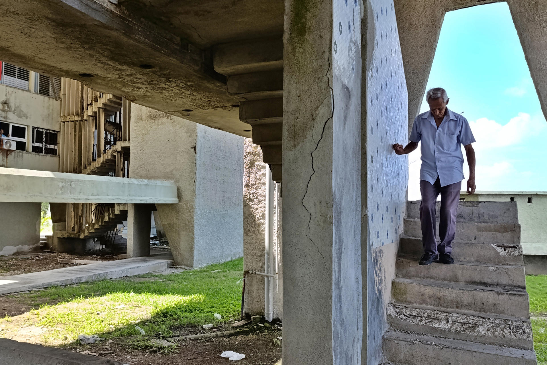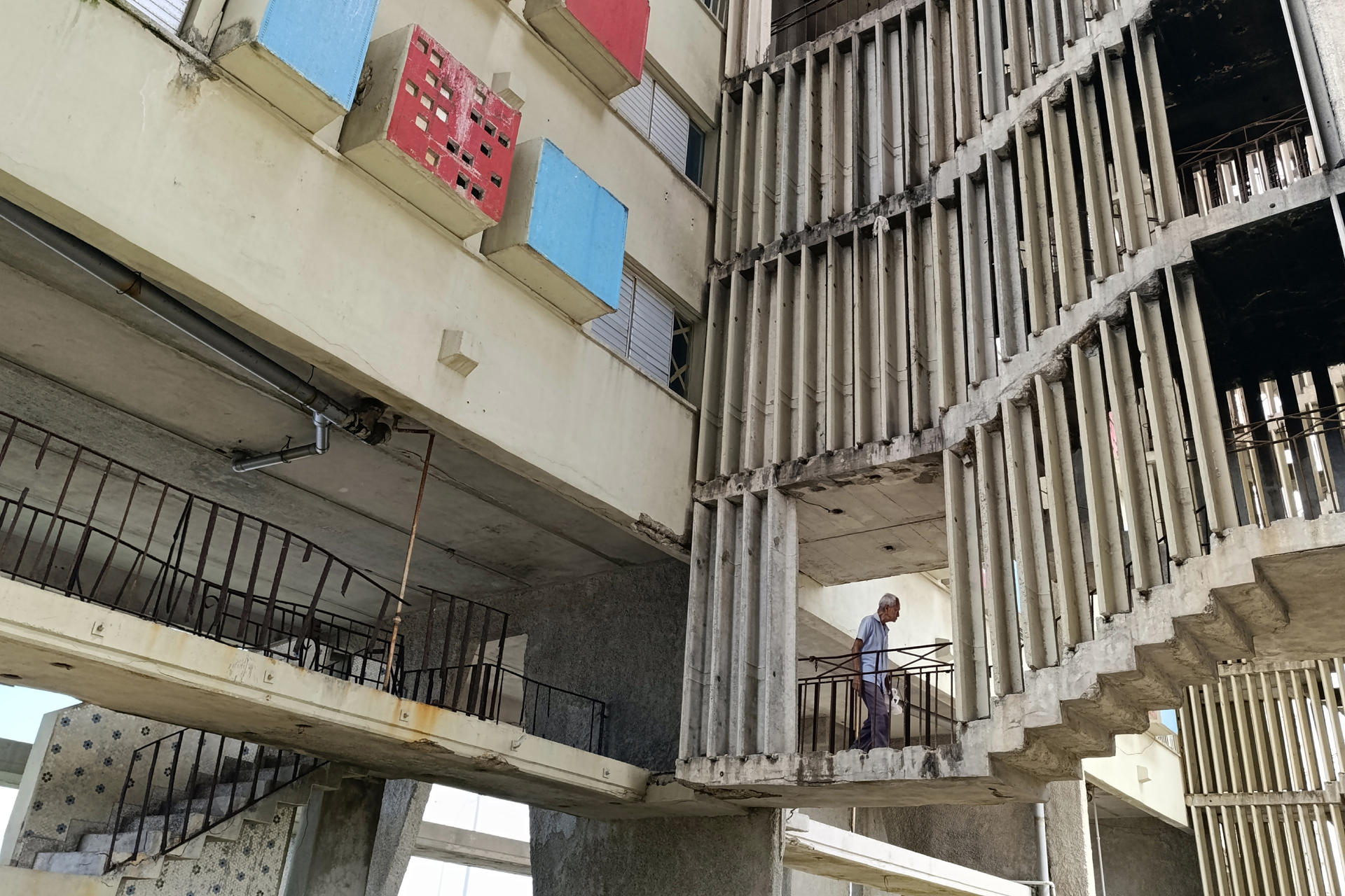 El edificio -un gigante de estilo brutalista inaugurado en 1967- ha sido víctima del paso del tiempo, el salitre y la falta de mantenimiento. Pero para el hombre la mala condición de esta torre doble de concreto con un total de 132 apartamentos -y muchas personas mayores- es lo de menos.