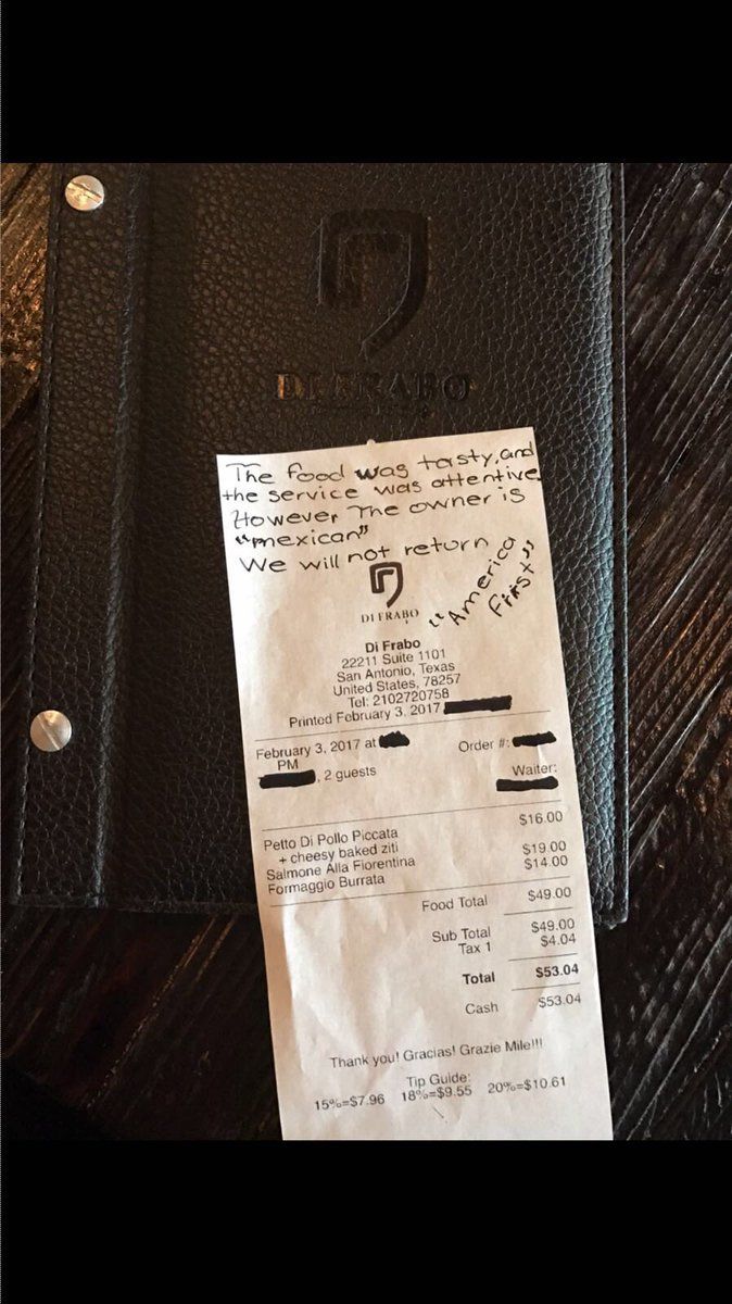 Una pareja de clientes de un restaurante italiano ubicado en una de las áreas más concurridas de San Antonio, Texas, dejó una nota en un recibo diciendo que no volverían porque “el dueño es mexicano”.