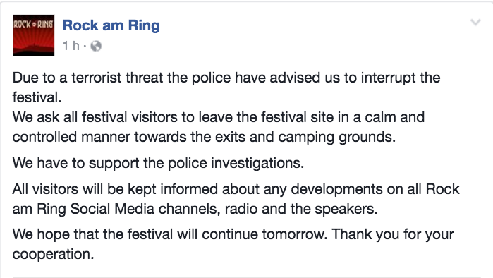 El festival Rock am Ring, uno de los más populares y consolidados del verano alemán, se ha celebrado habitualmente desde 1985 en el circuito automovilístico de Nürburgring. Los organizadores emitieron un comunicado donde esperan que el festival pueda continuar el sábado.