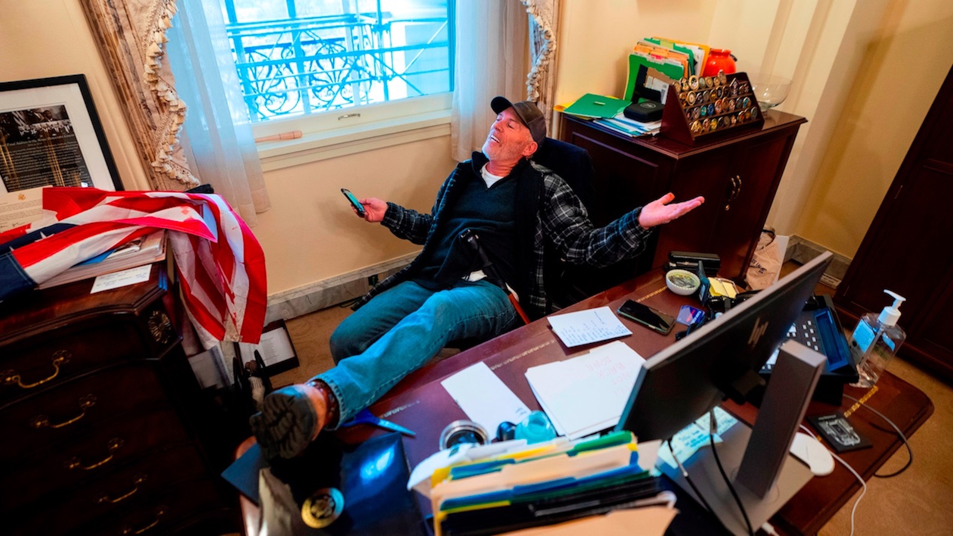 El individuo, identificado como Richard Barnett, ha sido acusado de entrada ilegal a un edificio restringido, entrada violenta y conducta desordenada en el Capitolio y robar propiedad pública, por el correo de la legisladora que presuntamente se llevó después de haber posado para los fotógrafos.