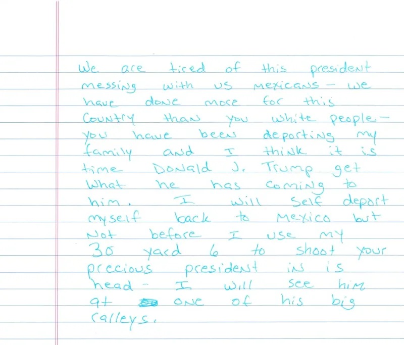 “Creo que es tiempo de que Donald J. Trump tenga lo que se merece”, escribió el mexicano Ramón Morales en una carta de amenaza