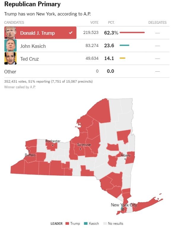 Se esperaba de antemano que el magnate venciera con facilidad a sus rivales Ted Cruz y John Kasich en la elección del martes. La distribución precisa de delegados del estado no será determinada hasta que los resultados sean contabilizados por distrito electoral, pero es seguro que Trump amplíe su ventaja en delegados y se acerque a los mil 237 que se requieren para asegurar la nominación del partido.