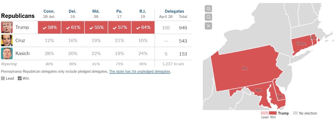 Donald Trump ganó las cinco elecciones primarias republicanas del martes, en una exhibición imponente por el noreste que lo mantiene como el favorito hacia la candidatura presidencial republicana, aunque con poco margen de error.