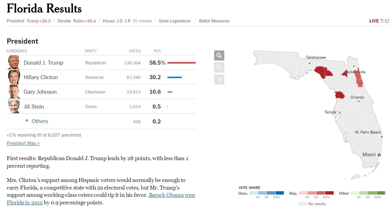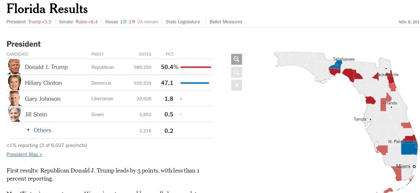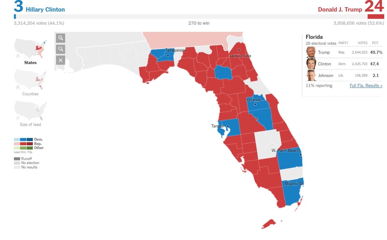 Donald Trump sigue manteniendo, aunque cada vez con más escaso margen, la ventaja en Florida. Con el 11 por ciento reportado, el republicano tiene un 49.7 por ciento de votos, frente al 17.4 por ciento de Clinton.
