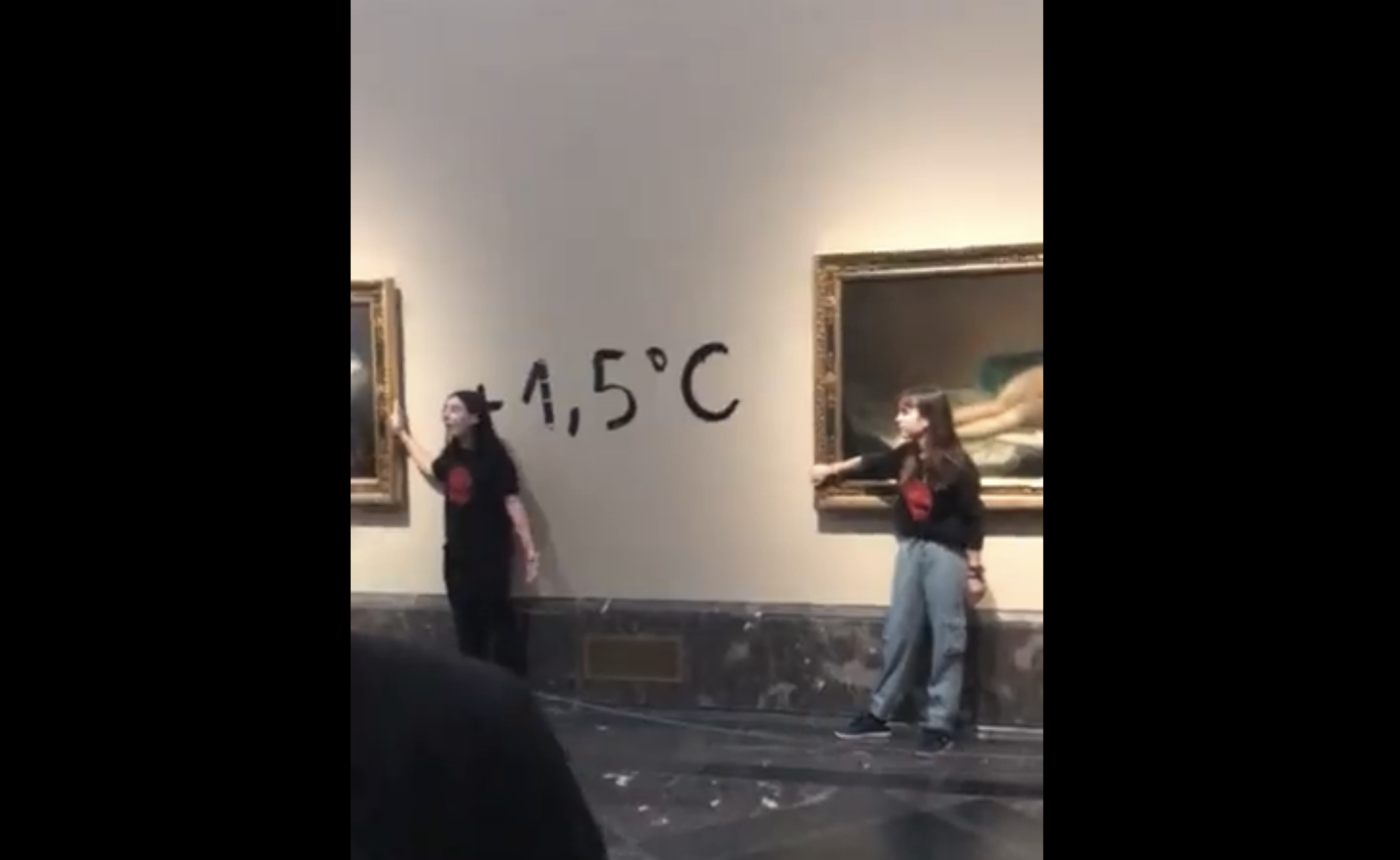Dos activistas de la organización Futuro Vegetal se pegaron a los marcos de los cuadros de ‘La maja vestida’ y ‘La maja desnuda’ del Museo del Prado y han escrito en la pared ‘+1.5°’ en referencia al anuncio de la ONU de la imposibilidad de cumplimiento del Acuerdo de París.