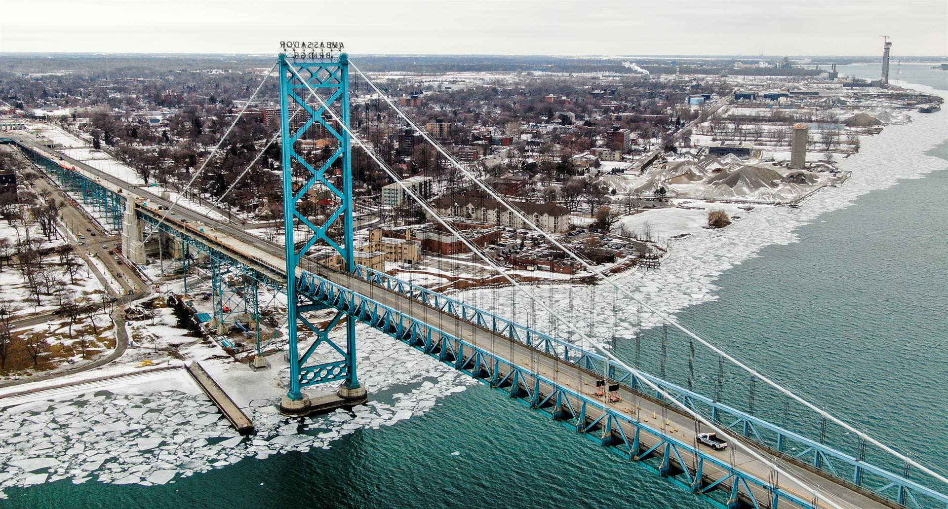 El puente Ambassador, que conecta las ciudades de Windsor (Canadá) y Detroit (EE.UU.) es el cruce terrestre más importante entre Canadá y Estados Unidos.