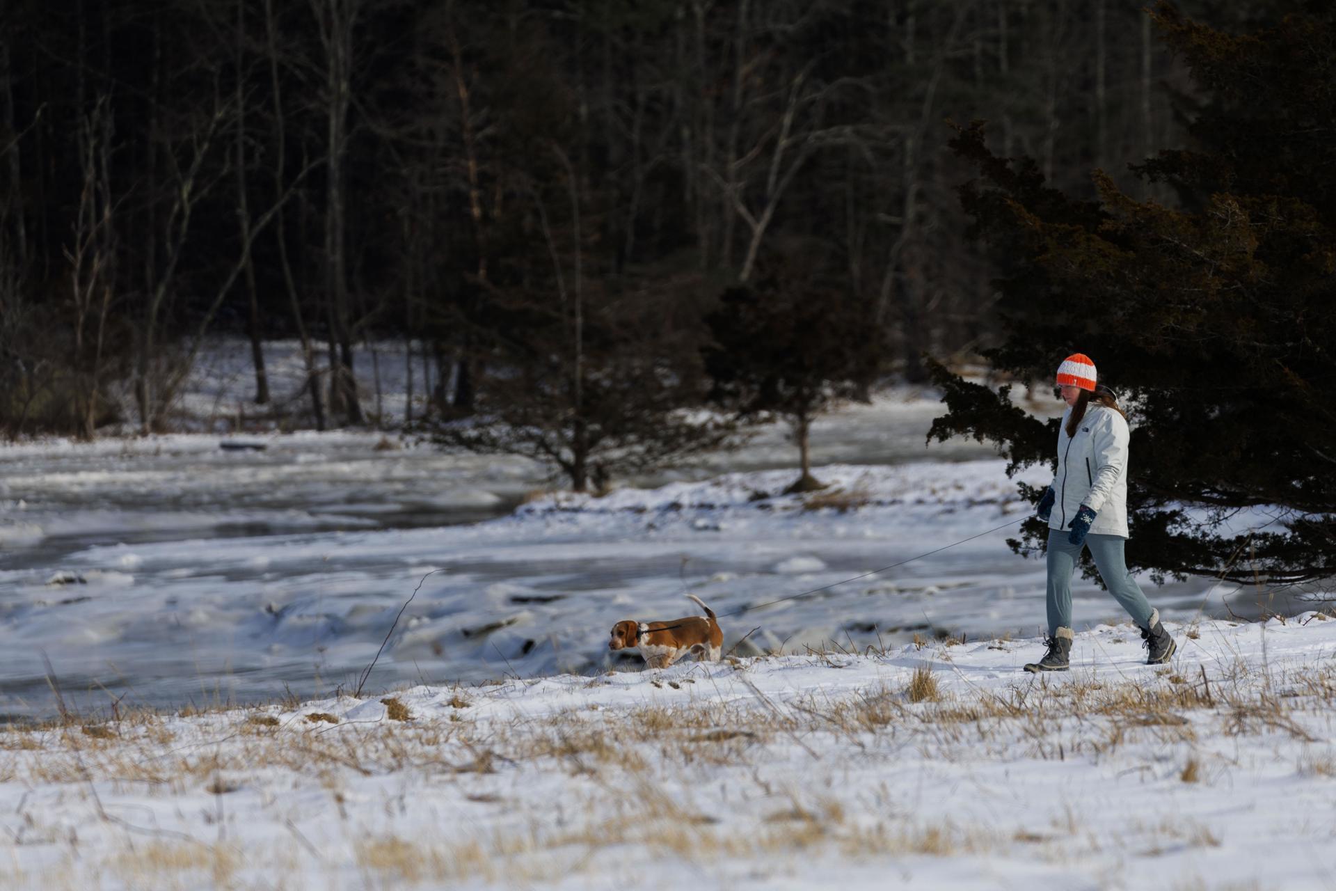 Mujer pasea a su perro durante bajas temperaturas en EE.UU. Foto de EFE/EPA/CJ GUNTHER