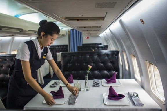 Al resto del avión se le retiraron los asientos de pasajeros para poner mesas y bancas. Sin embargo, las meseras visten como azafatas y los hombres como pilotos.