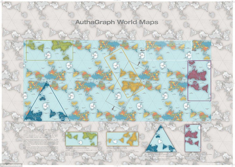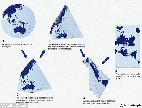 Hajime Narukawa, el autor del mapa, indicó que dividió el globo esférico en 96 triángulos, mismos que fueron aplanados y transferidos a un tetraedro.