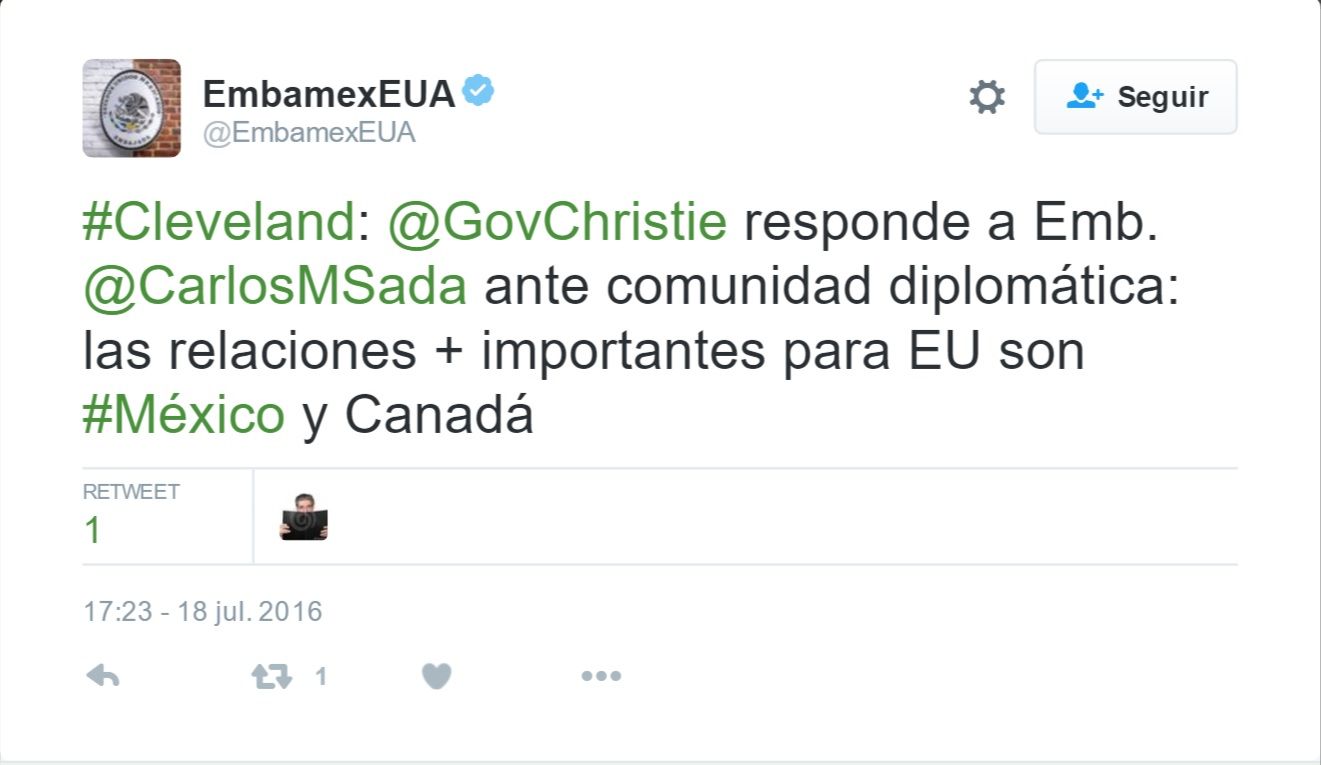 La embajada mexicana publicó en su cuenta de Twitter que Christie le respondió a Sada y a la comunidad diplomática que “las relaciones más importantes para Estados Unidos son #México y Canadá”.