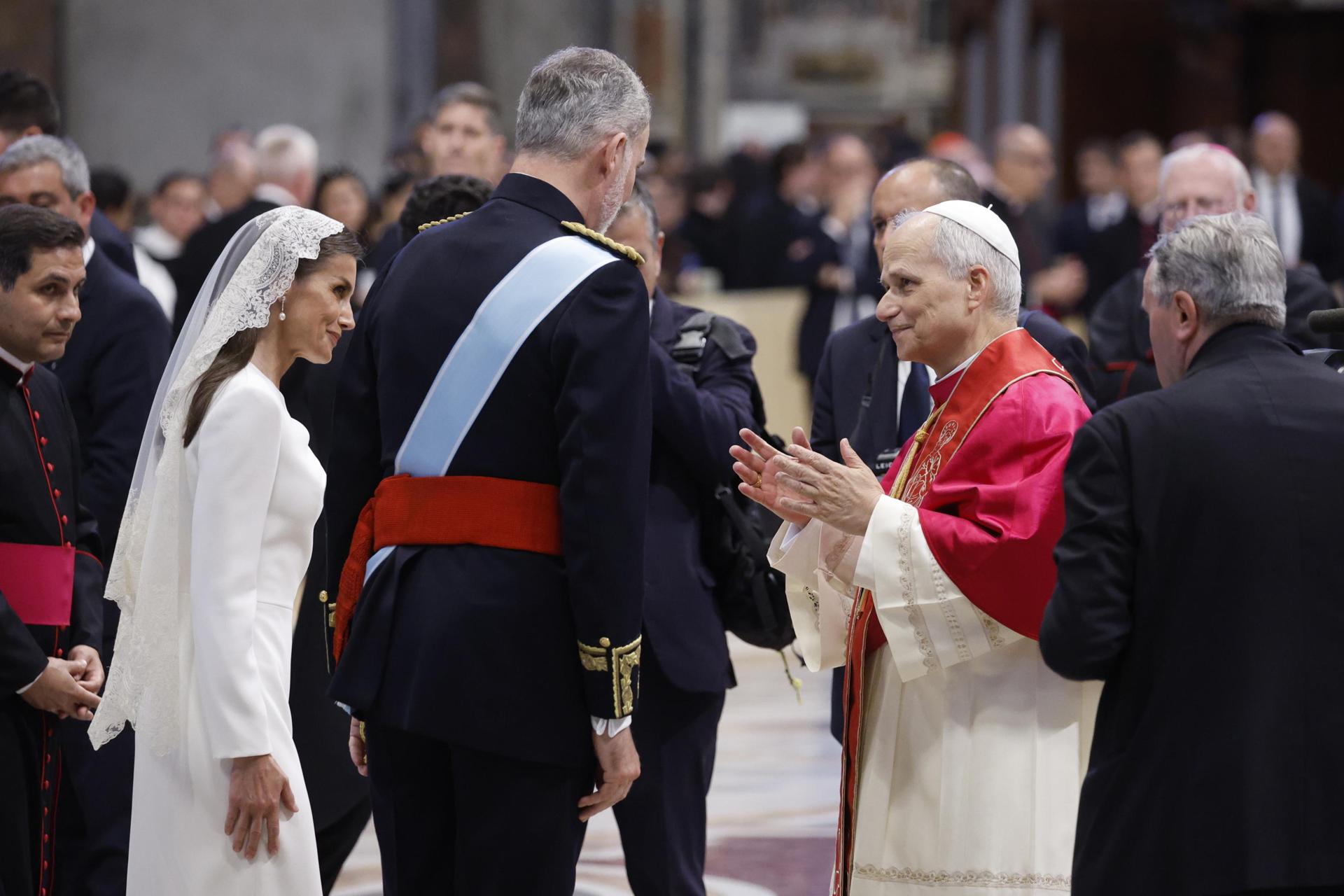 El papa saludó a los reyes de España, Don Felipe y Doña Letizia, y el monarca español se entretuvo hablando varios minutos en español con León XIV en un tono cordial.