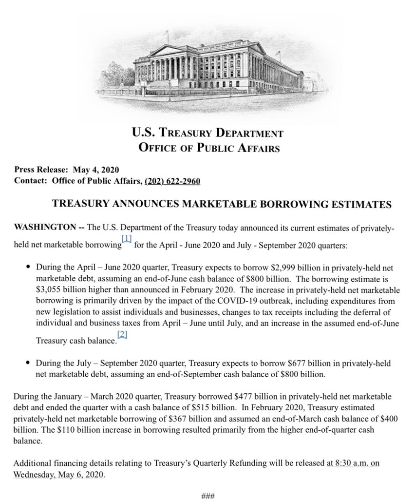 En un comunicado, el Tesoro indicó que planea pedir prestados otros 677 mil millones para el tercer trimestre (julio, agosto y septiembre), por lo que al final de año se podría alcanzar un número récord de déficit, ya que en los primeros seis meses del actual año fiscal (desde octubre de 2019 hasta marzo de este año), EE.UU. ya emitió 744 mil millones de deuda.