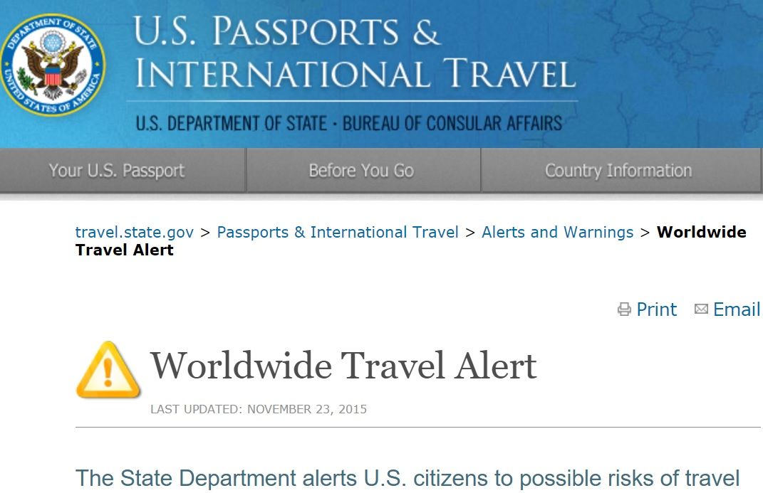 “Alerta de Viaje. El Departamento de Estado de los Estados Unidos alerta a los ciudadanos de los posibles riesgos de los viajes debido al aumento de las amenazas terroristas”, señala el mensaje.
