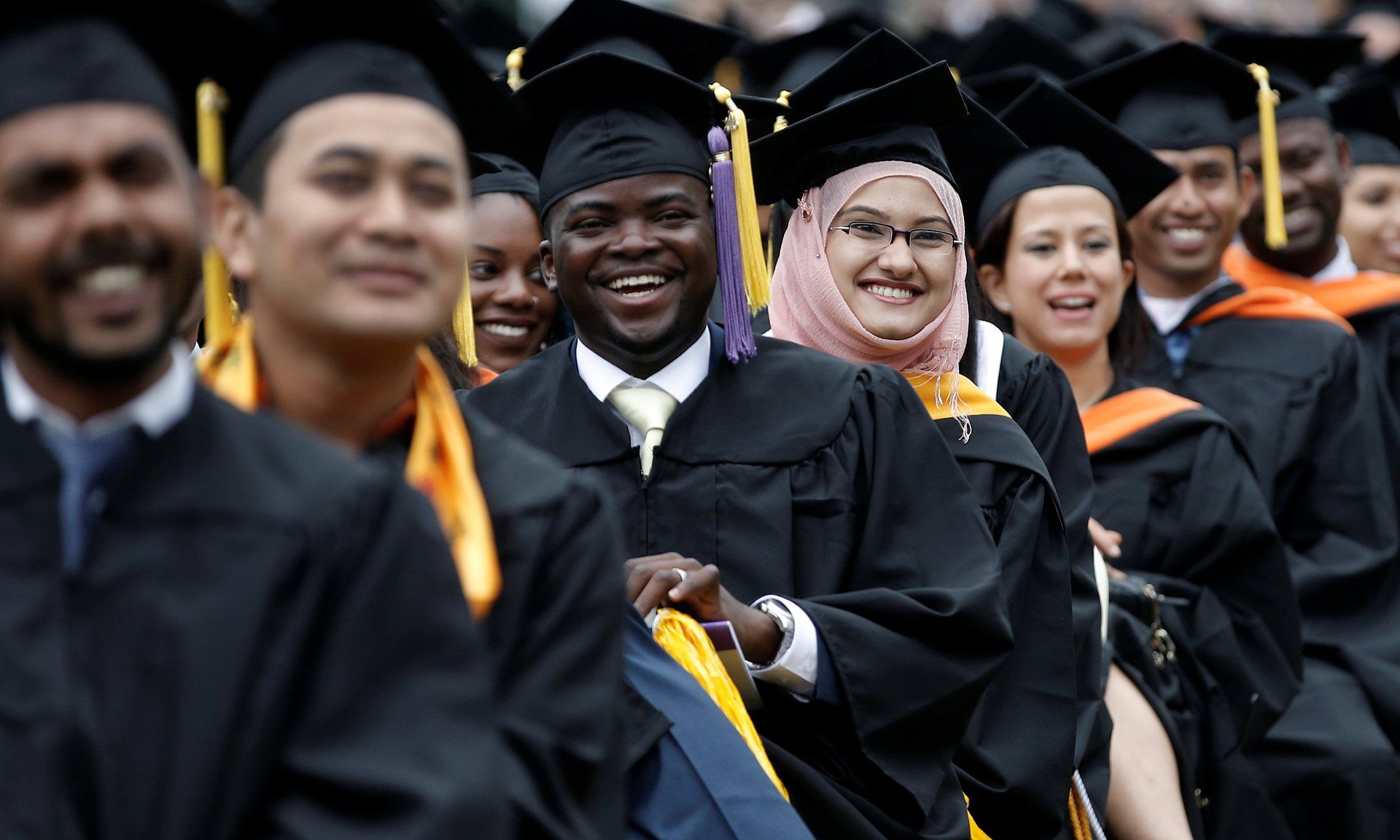 “No, aquí no necesitamos muros en la frontera ni vetar la entrada de los musulmanes (…) nosotros somos un buen ejemplo de lo que el resto de Estados Unidos puede llegar a ser”, dijo Orubba Almansouri en representación de los recién graduados.