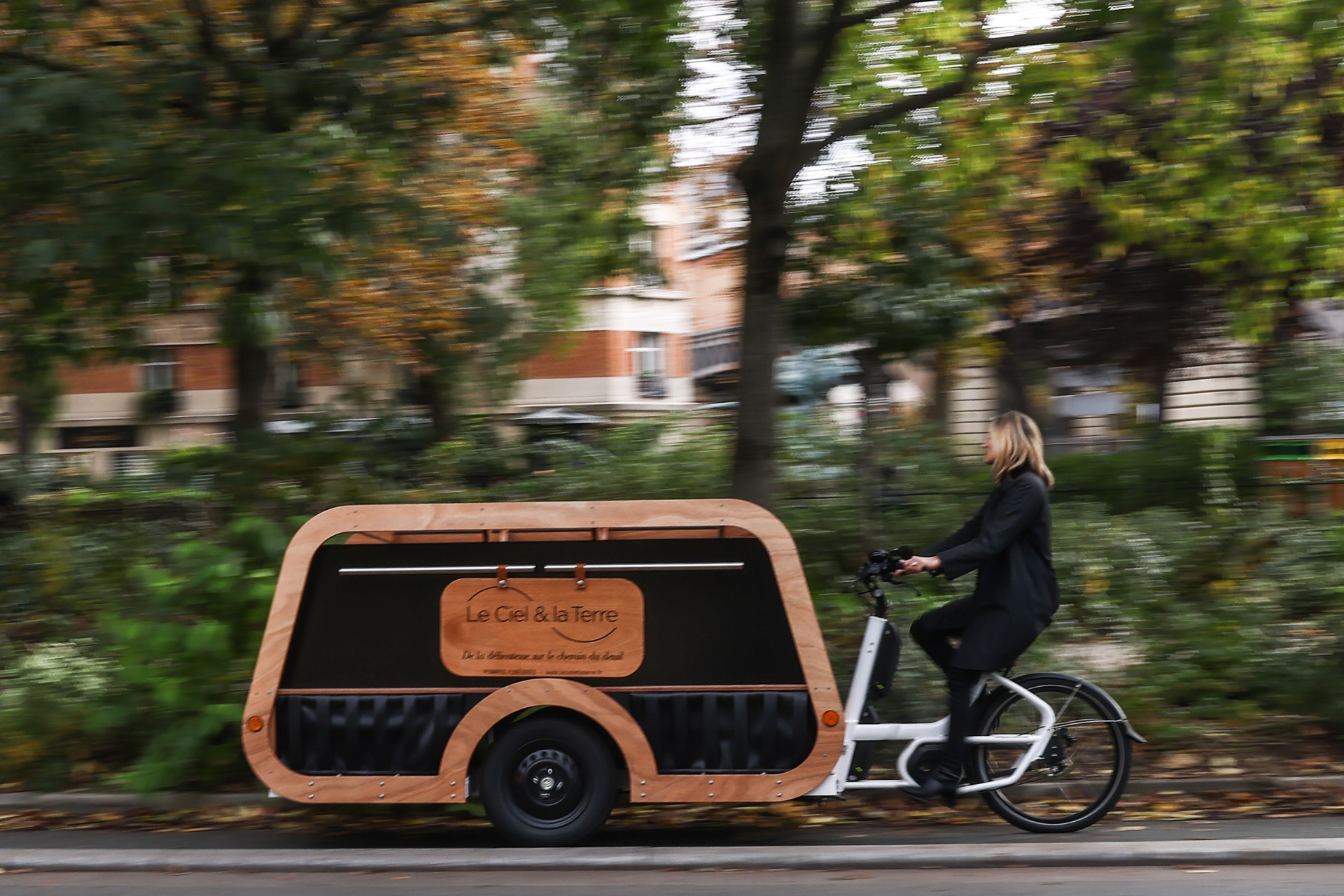 El vehículo, de origen neerlandés, funciona “a base de músculo”, destaca la parisina, si bien cuenta con asistencia eléctrica, y tiene una plataforma delantera sólida sobre la que se coloca el habitáculo para llevar el féretro.
